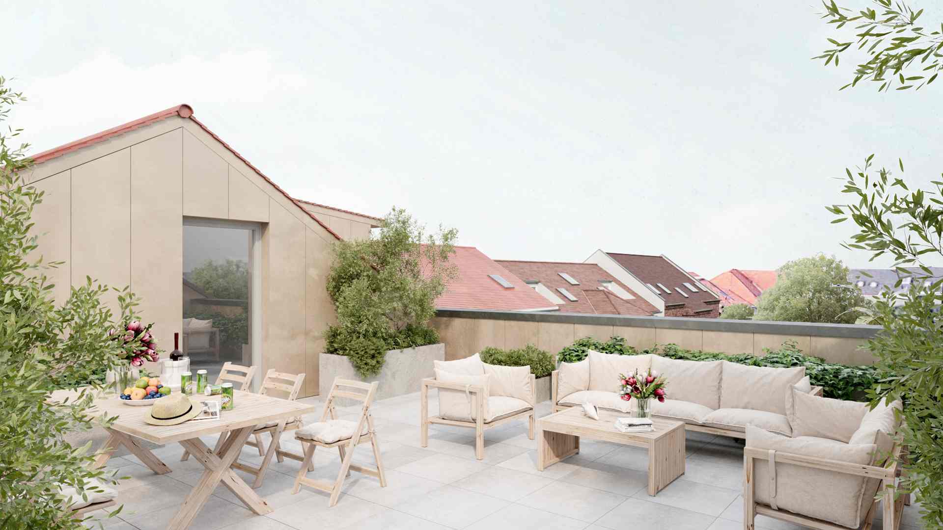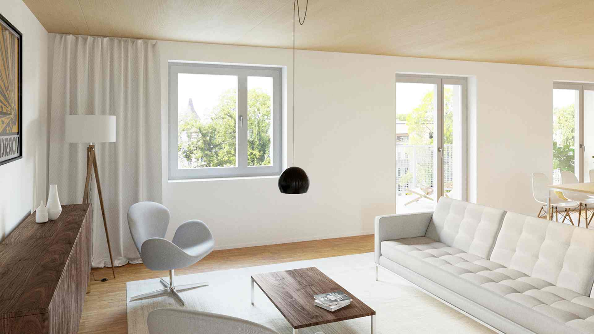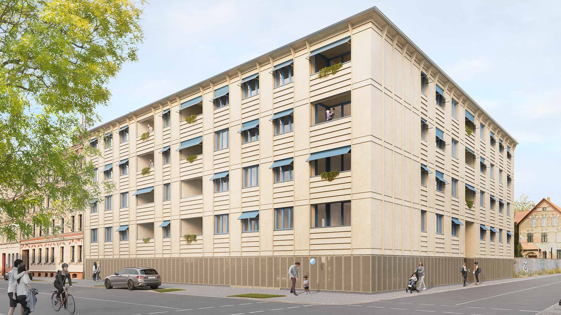 Mit dem Domizil Julius-Krause-Straße entsteht ein modernes Wohnhaus, das zeitlose Architektur mit nachhaltiger Bauweise verbindet. Die tragenden Elemente der Wohngeschosse werden in Holz ausgeführt, welches auch in den Decken sichtbar bleibt und den Wohnungen eine warme, natürliche Atmosphäre verleiht. Die Fassade erhält eine hochwertige, langlebige Gestaltung aus Faserzementplatten.